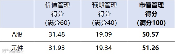 拆分来看,行业上市公司价值管理得分31.93,略高于A股平均水平;预期管理得分19.34,略高于A股同期表现。