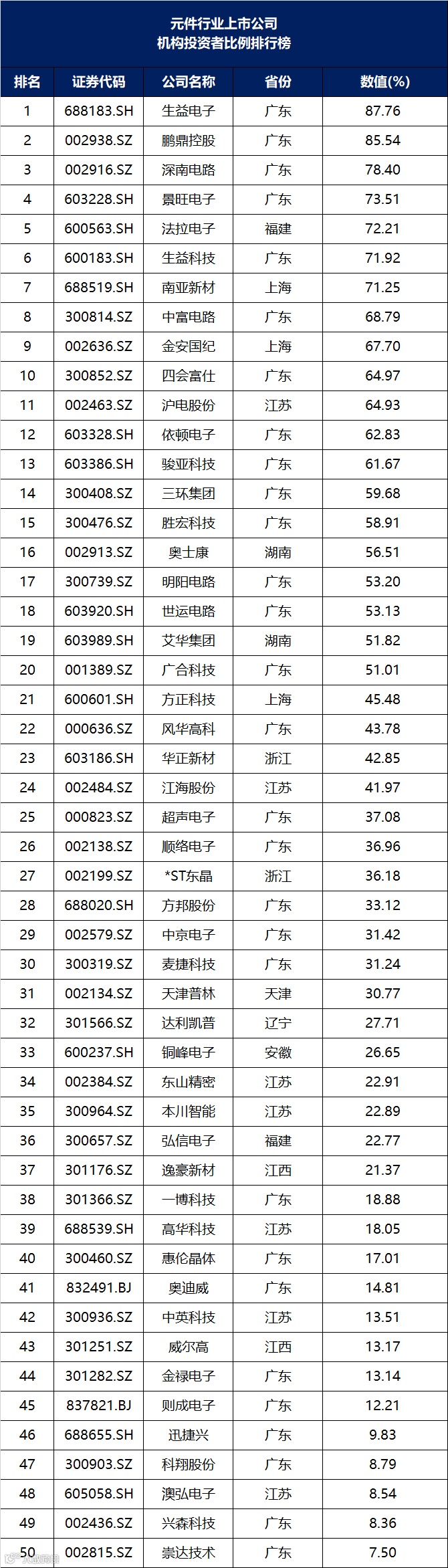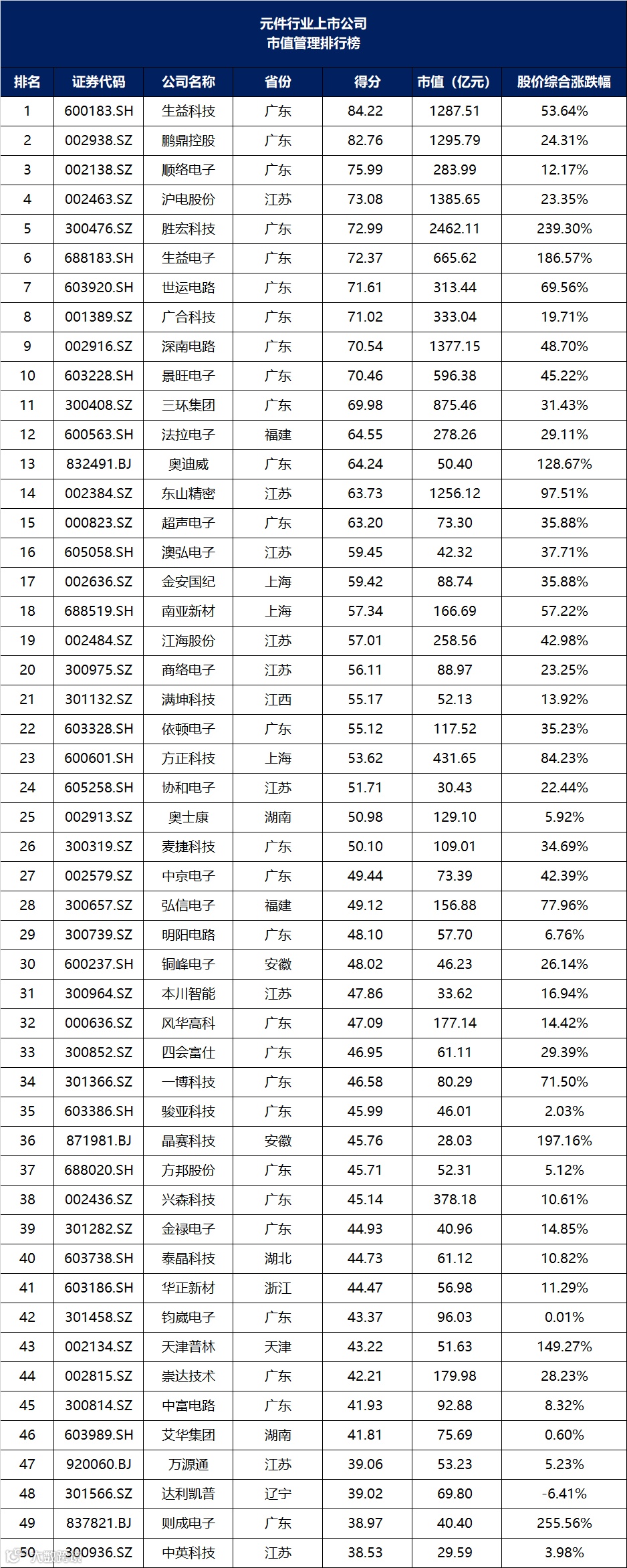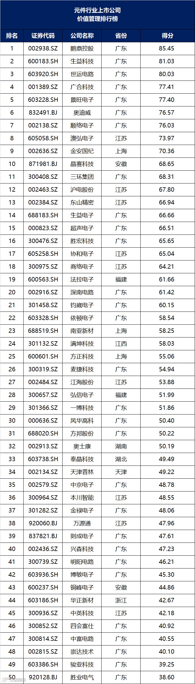 2025年上半年,元件行业上市公司价值管理排名第1的是鹏鼎控股,得分85.45分;生益科技排名第2,得分81.03分;世运电路排名第3,得分80.03分。