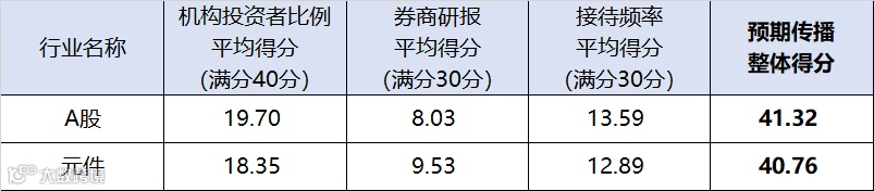 满分100分的情况下,2025年上半年元件行业上市公司的预期传播得分40.76,低于与A股同期得分(41.32)。