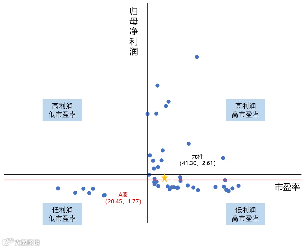 再以元件行业上市公司归母净利润以及市盈率均值为原点,把上市公司的数据放进四象限中,我们就可以看出,行业内仅有少数上市公司处于“高利润高市盈率”区间,相当多企业仍处于“高利润低市盈率”区间,市场对行业上市公司的估值分化显著。