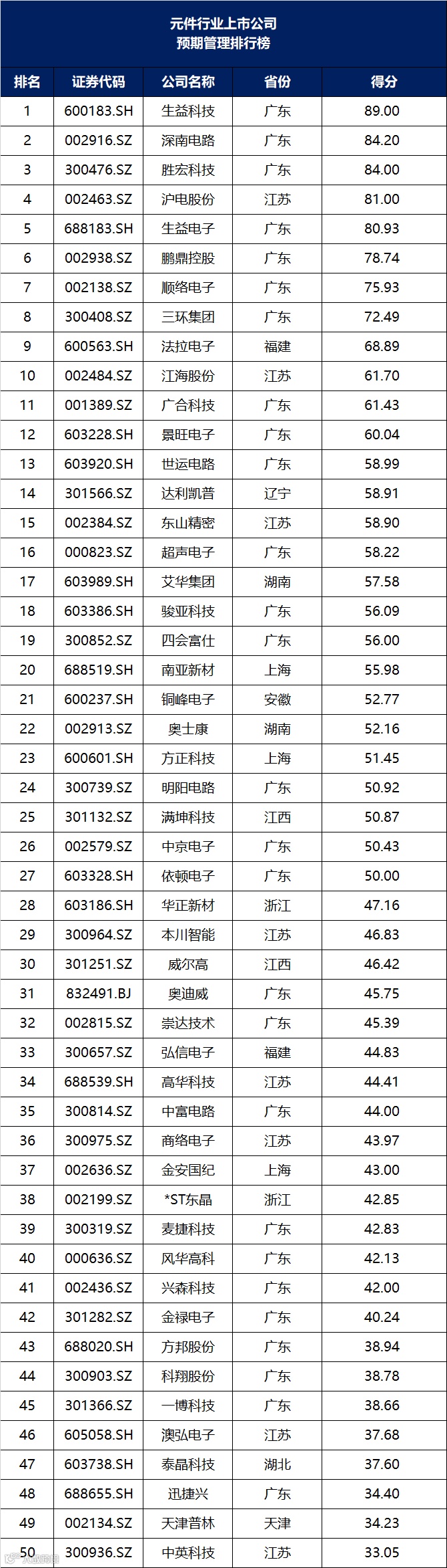 元件行业上市公司预期管理排行榜