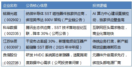 亮点:公司公告显示,SST 配套用变压器处于研发阶段,依托 30 年变压器制造经验,联手维谛技术开发样机,绑定腾讯、百度需求及光伏并网场景。