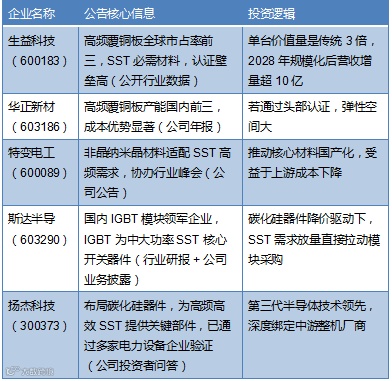 核心元器件涵盖功率半导体、高频材料等关键部件,是 SST 效率与成本控制的核心变量。