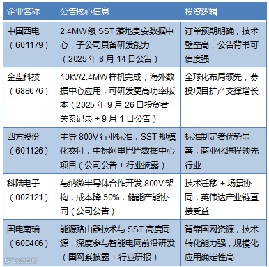 2.技术突破:中国西电 8 月 14 日公告披露,子公司西安西电电力电子的 2.4MW 级 SST 于 2023 年 9 月在贵安数据中心投运,效率超 97.5%;金盘科技 9 月 26 日投资者关系记录显示,10kV/2.4MW SST 样机已完成,适配 800V 架构。