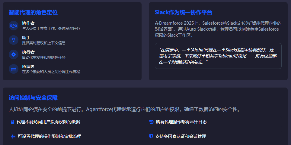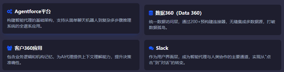 客户 360 应用包含业务逻辑和机构记忆,为 AI 代理提供上下文理解能力。而Slack作为用户界面层,成为智能代理与人类协作的主要通道,实现了从 "点击" 到 "对话" 的工作方式转变。
