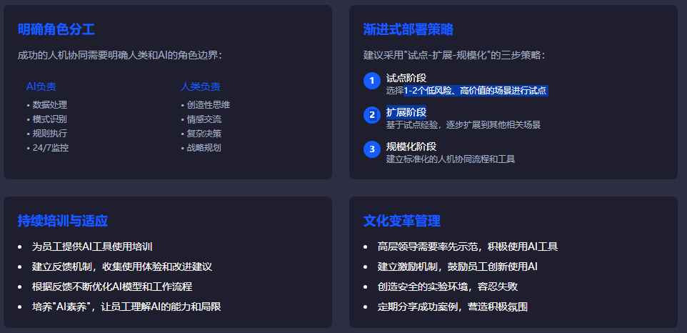 基于成功案例的分析,人机协同工作模式的实施需要遵循以下框架: