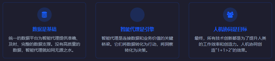 人机协同是目标:最终,所有的技术创新都是为了提升人类的工作效率和创造力。人机协同不是简单的替代关系,而是一种共生关系 ——AI 增强人类能力,人类指导 AI 发展。这种协同创造了 "1+1>2" 的效果,使企业能够实现前所未有的创新和增长。