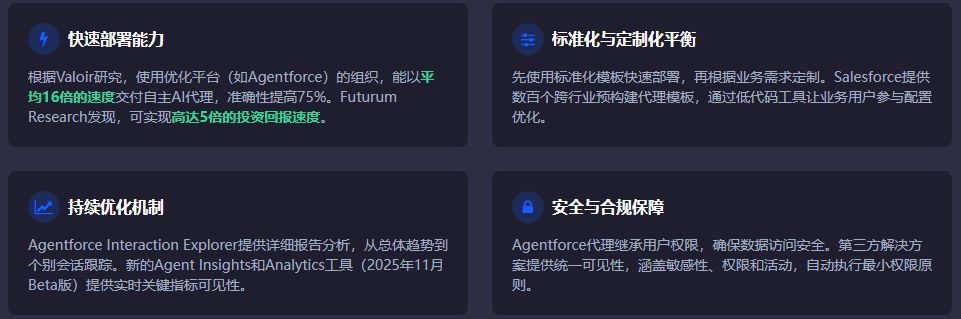 标准化与定制化的平衡:成功的实施策略是先使用标准化模板快速部署,再根据具体业务需求进行定制。Salesforce 提供了数百个跨行业的预构建代理模板,大幅缩短了部署时间。同时,通过低代码和无代码工具,业务用户也能参与代理的配置和优化。