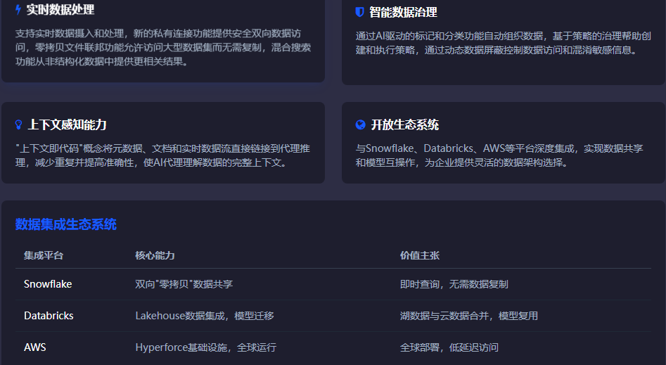 智能数据治理:通过 AI 驱动的标记和分类功能,系统能够自动标记和组织数据及元数据。基于策略的治理帮助用户创建、执行和管理策略,通过动态数据屏蔽控制数据访问和混淆敏感信息。
