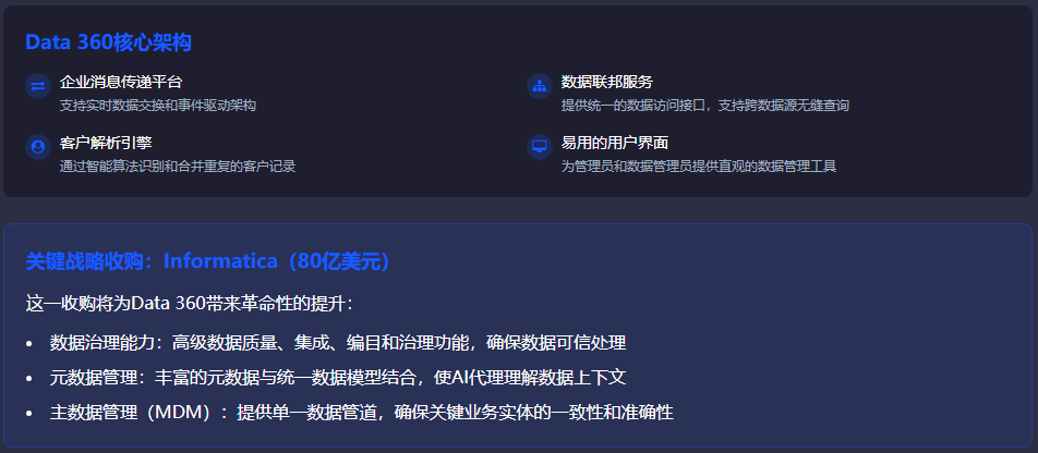 特别值得关注的是 Salesforce 在 2025 年 5 月宣布的80 亿美元收购 Informatica计划。这一收购将为 Data 360 带来革命性的提升: