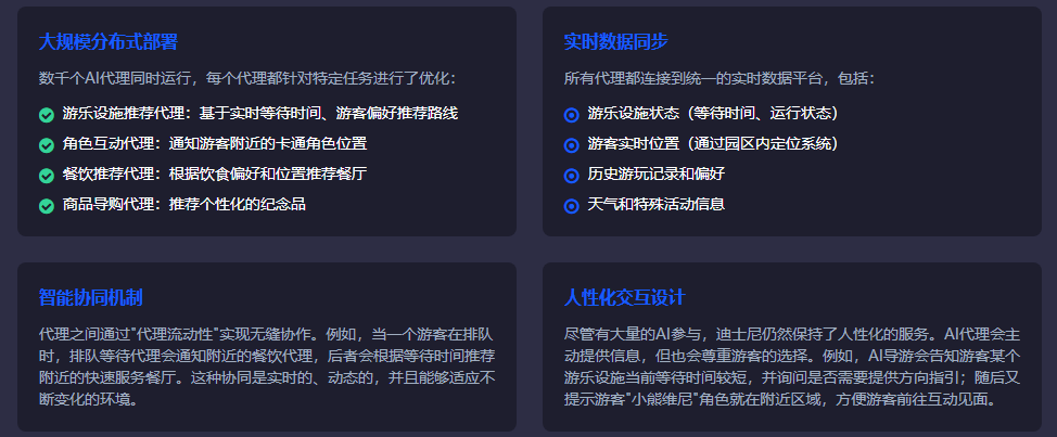 智能协同机制:代理之间通过 "代理流动性" 实现无缝协作。例如,当一个游客在排队时,排队等待代理会通知附近的餐饮代理,后者会根据等待时间推荐附近的快速服务餐厅。这种协同是实时的、动态的,并且能够适应不断变化的环境。