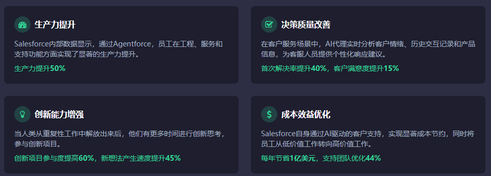生产力提升:Salesforce 内部数据显示,通过 Agentforce,员工在工程、服务和支持功能方面实现了50% 的生产力提升。这种提升不是通过简单的自动化,而是通过智能代理承担繁琐的任务,让人类员工专注于创造性和战略性工作。
