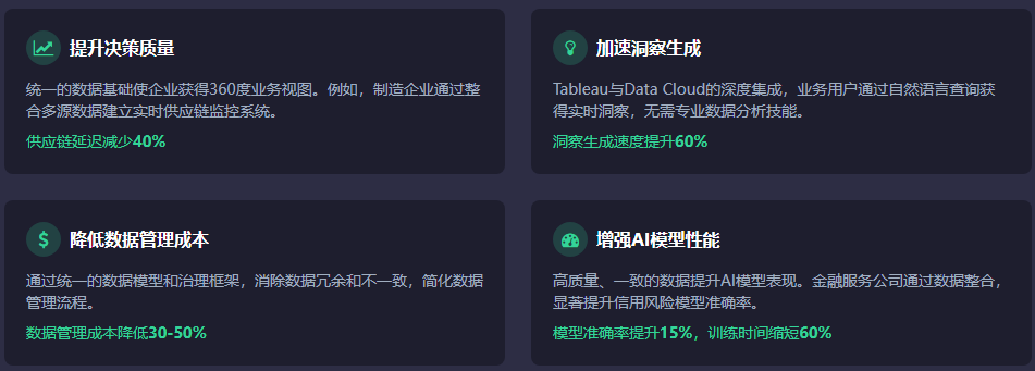 增强 AI 模型性能:高质量、一致的数据是训练有效 AI 模型的基础。通过 Data 360 提供的清洗、标准化和丰富的数据,企业的 AI 模型表现得到显著提升。例如,一家金融服务公司通过整合和清洗客户数据,将其信用风险模型的准确率提升了15%,同时将模型训练时间缩短了60%。
