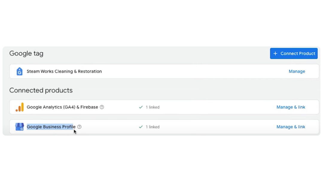 首先关联您的 Google 商家资料 (GBP) – 我们将在第 2 步中单独介绍这一点。如果已关联,您应该会在 Google Ads 帐号中的数据管理器中看到以下内容: