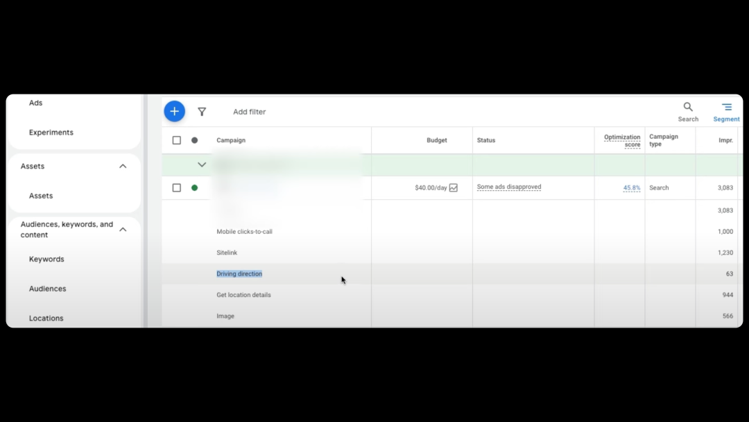 使用 Google Ads 中的“细分 > 点击类型”功能。然后查看“驾车路线”或“获取位置详情”等互动类型,这些互动表示广告已经在 Google 地图中展示。