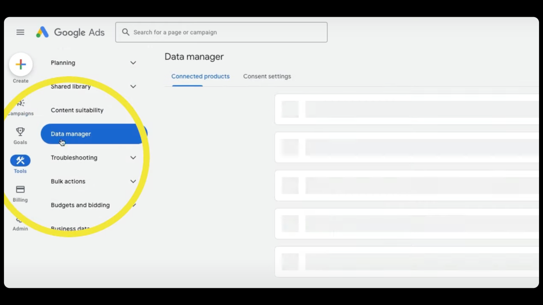 选择“关联帐户”或“数据管理器” - 根据 Google Ads 界面,查找名为“数据管理器”或“关联帐户”的选项。