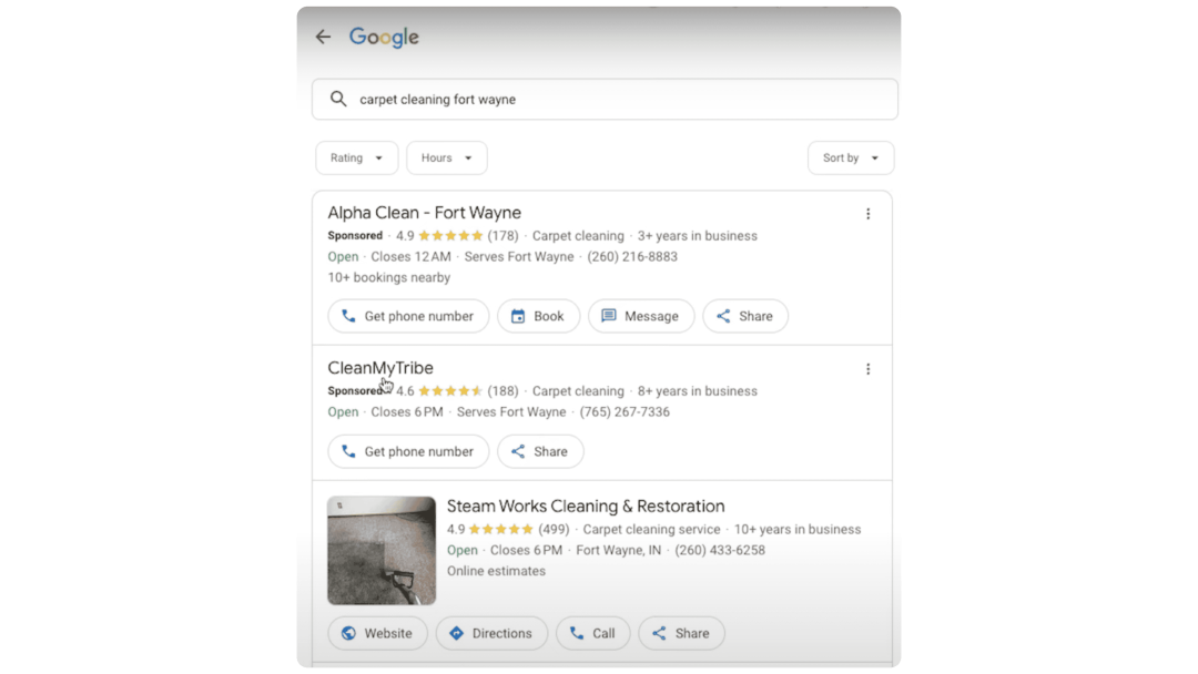 高曝光度:Google Ads 地图中的广告位于顶部位置。寻找服务的用户在向下滚动查看其他商家信息之前,就能看到您的商家名称和位置信息。