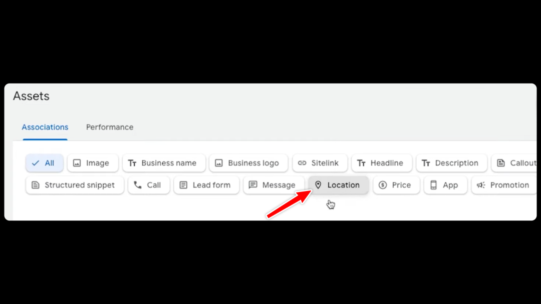 添加“地理位置”资产:选择地理位置资产并链接上面提到的的 Google 商家信息账户。