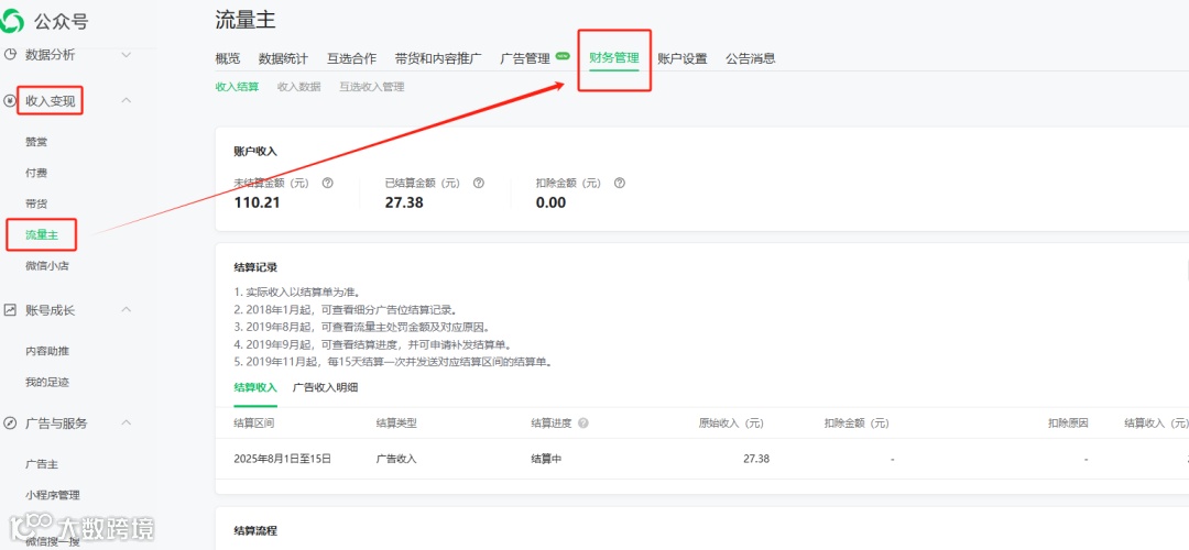 👉登录公众号后台 → 【流量主】→ 【财务管理】→ 【结算记录】,可查看每笔收入的状态(结算中/已结算/已付款)。