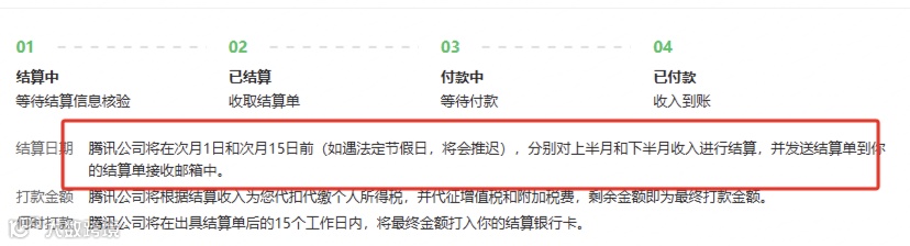 👉结算完成后,腾讯会在5个工作日内发起打款。如:10月10日结算完成,最晚10月17日(5个工作日)前会到账。