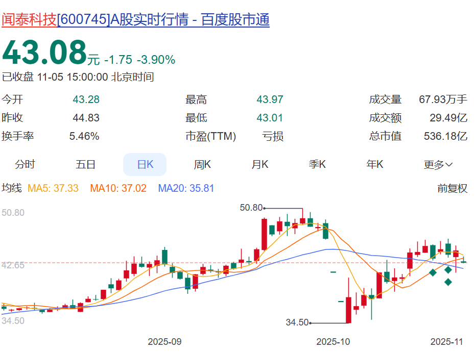 截至11月5日收盘,闻泰科技股价跌3.6%,报收43.08元,较10月中旬的低点已涨超24%,总市值536.18亿元。