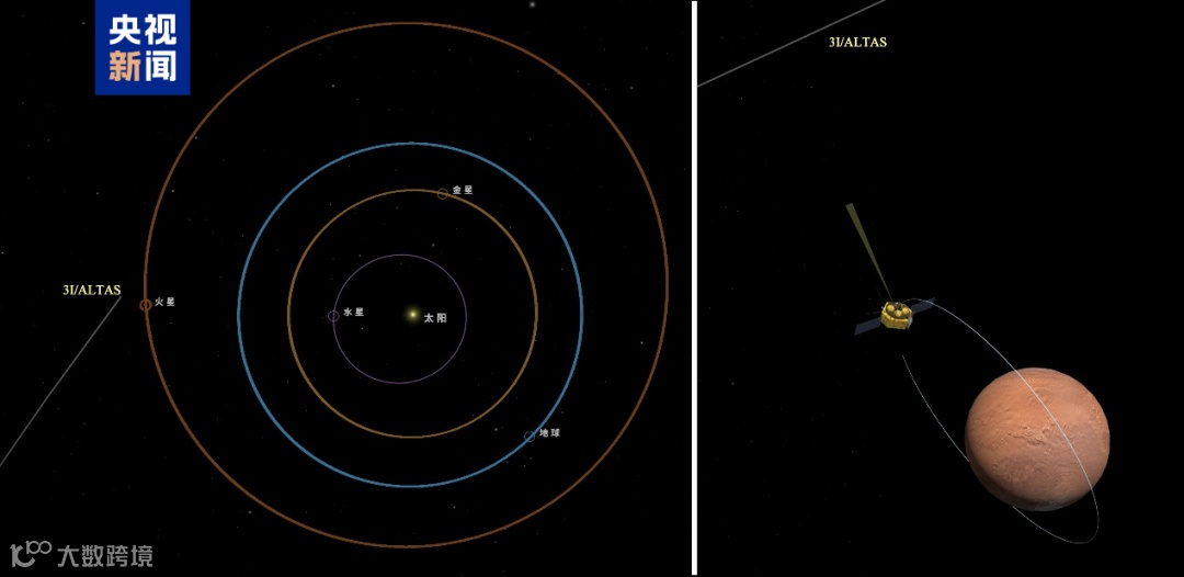 △星际天体阿特拉斯与天问一号火星环绕器相对位置示意图(右图是2025年10月3日相机拍摄时左图的局部放大)