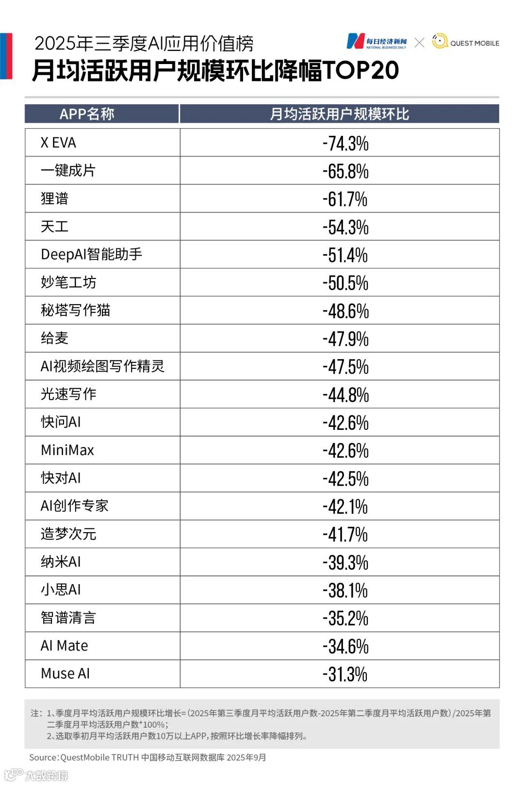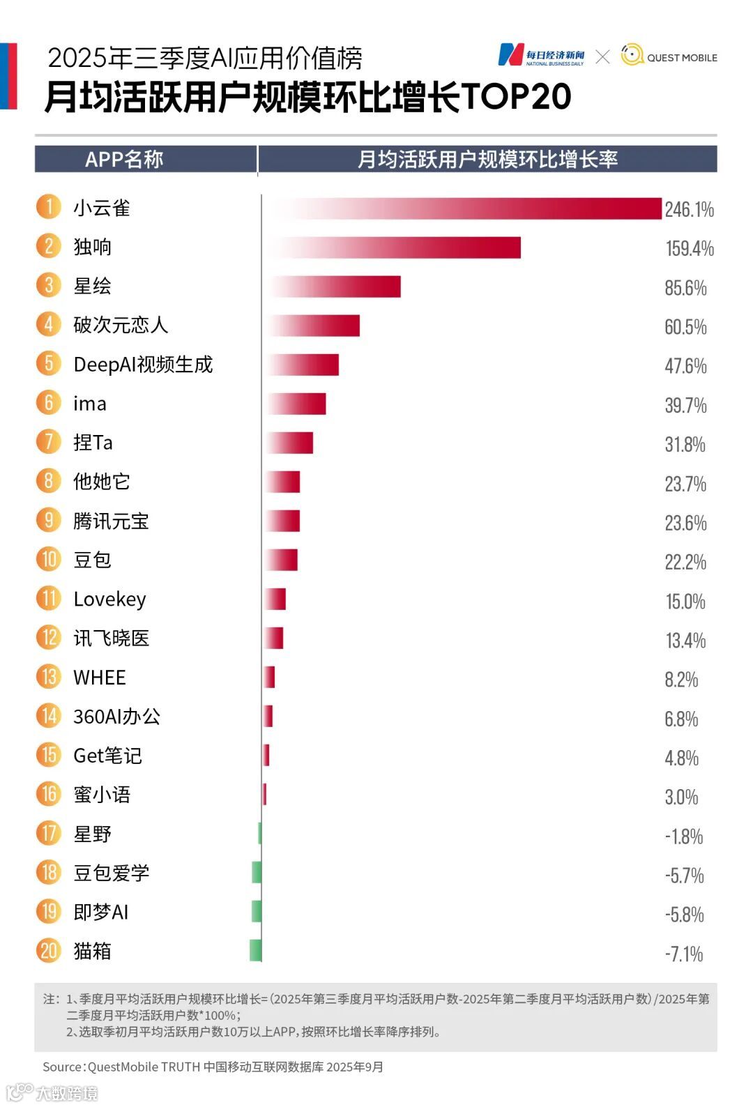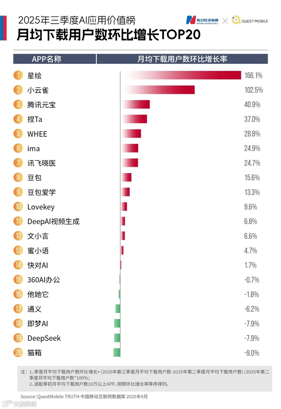 2025年第三季度,AI应用市场呈现出明显的两极分化。《每日经济新闻》联合QuestMobile推出《2025年三季度AI应用价值榜》,基于月均下载量与月活跃用户数(以下简称“月活”)两大核心指标,揭示AI应用“下半场”的新变局。