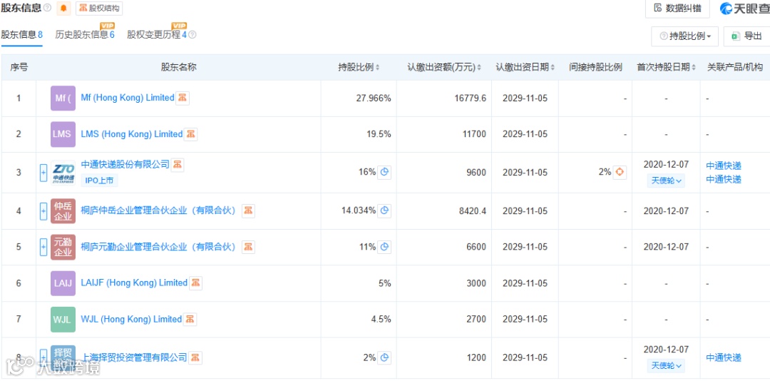 天眼查信息显示,中通冷链主公司中通云冷网络科技(浙江)有限公司,法定代表人为孟峰,注册资本为60000万人民币,中通快递股份有限公司直接持股16%。