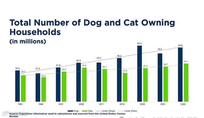 北美市场凭借约40%的全球宠物消费市场份额占据主导地位,其中美国家庭宠物拥有率超66%[k]。根据美国宠物行业协会(APPA)数据,2023年美国宠物行业总支出达1470亿美元,预计2024年将增长至1506亿美元[k]。