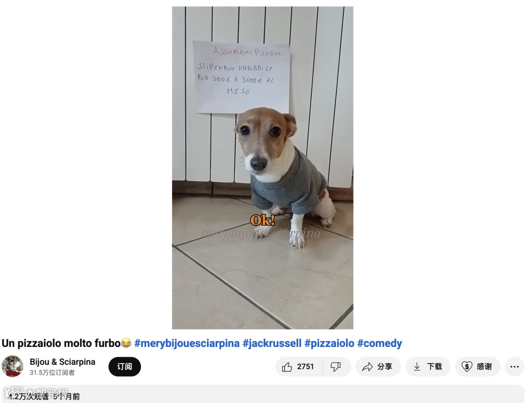 在营销策略上,Furbo广泛布局Instagram、TikTok和YouTube平台,设立专属话题并联合头部至尾部KOL开展合作,累计合作视频超4万条[k]。其中,YouTube中尾部达人Bijou & Sciarpina以萌宠杰克罗素犬为主角,通过“聪明的披萨师傅”等情景喜剧内容,成功吸引大量粉丝[k]。