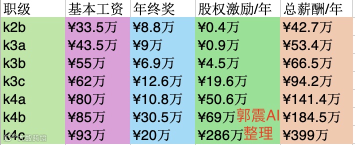 其中,k3c级别对标阿里P7,年薪接近百万,且自该级别起股权激励显著提升,低于k3c则股权较少或无[k]。