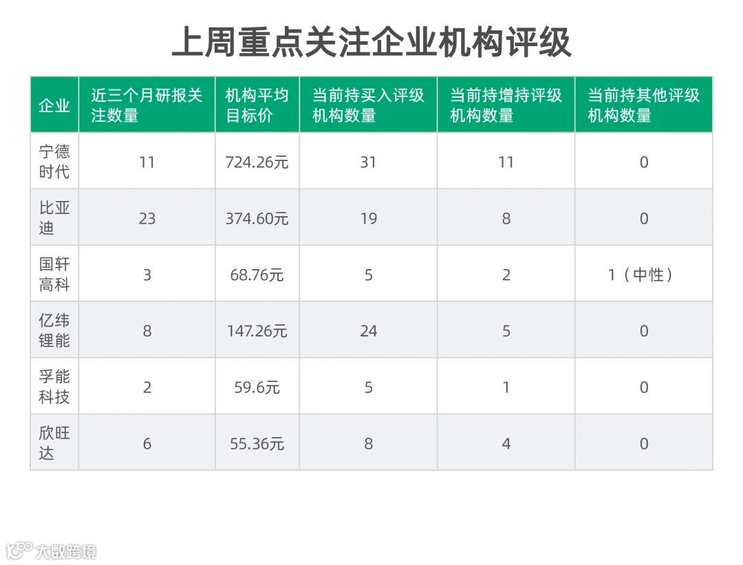 上周机构重点关注了动力电池领域个股。浙商证券分析认为,市场对于锂金属价格上涨造成的电池成本和毛利率影响过于担心,当前电池价格涨幅已高比例传导原材料成本的上涨。同时,车企以市占率和销量为核心目标,高销量摊薄研发投入和高杠杆固定资产,短期毛利下降不改长期战略规划。因此主流车企未来大概率不会或者微幅上调已上市车型指导价,对销量影响有限。预计2022年全球锂电池需求可达943.3GWh,同比增长56%,建议持续关注锂电池产业链。