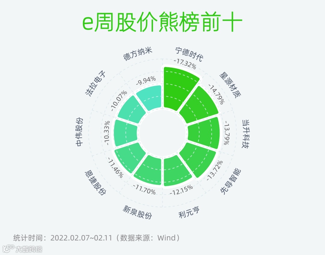 股价跌幅方面,宁德时代(300750.SZ)周内下跌17.32%,坐上“负班长”的位置。曾经风光无两的“宁王”,虎年以来连遭暴击,几天时间便抹去2700亿元市值。2月11日,宁德时代股价全天潜在“水下”,最终收跌5.43%,收盘价489.99元/股,市值1.14万亿元。