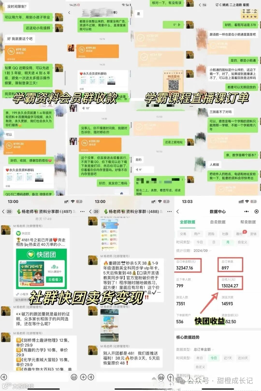 当我们积累到一定会员数量后,就可以运营微信社群了,社群主要功能在于分享资料,推荐教辅产品。所有产品由快团团平台提供货源,我们只需要分享链接,用户下单,咱们赚佣金。不用囤货,不用发货,赚的都是纯利润。