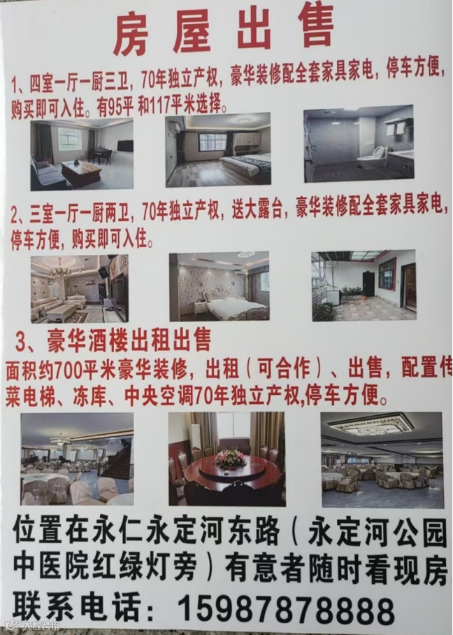 位于永仁县一中后大门上行150米,新建住房多套出售。面积为83-109平方,单价为2300-2900元/平方米。另有永仁县医院旁金和商住楼下面,门市出租或出售。