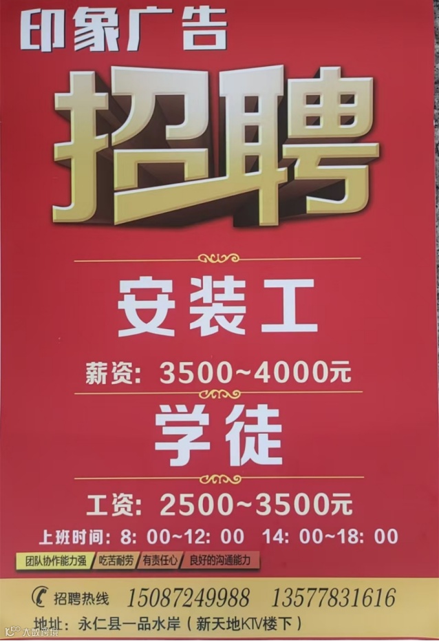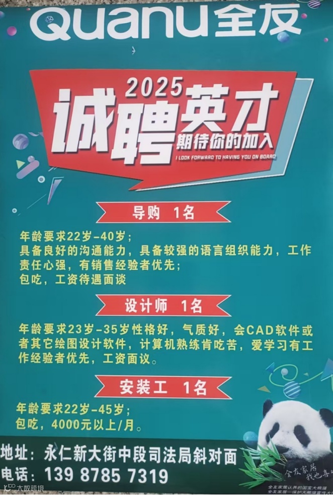 派尼尔家居 双虎家居。安装工2名,懂家具安装,会开车者优先。导购2名,年龄20一45岁,有相关工作经验者优先。学徒1名,会开车者优先。工资待遇:优厚 有意者面谈。地址:永仁永宝大商汇北门直行100米。