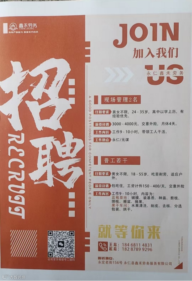 永仁鑫禾劳务服务有限公司招聘工人数名。蓝莓基地普工,包装工(男女不限) 待遇:包吃包住,购买意外险。点天120/天需按质按量完成当天工作量。计件150-400/天不等多劳多得,加班 15 元/小时。工作内容:蓝莓基地采花、摘果、包装。要求:年龄18-59 岁,吃苦耐劳,服从管理,适应大棚工作环境。无心脏病 无三高 无色盲 无传染病。工作地点:永仁县周边蓝莓基地。
