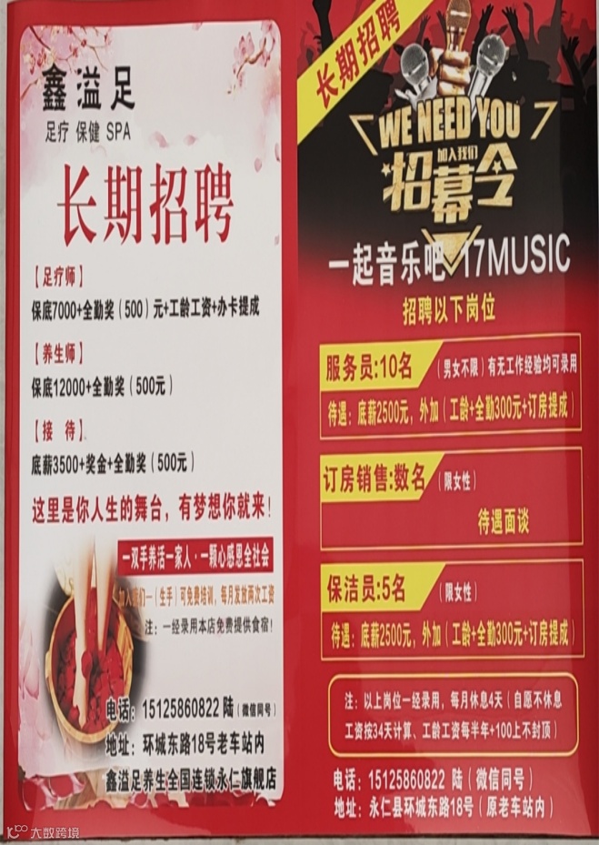 招聘单位:阳光四季康养公寓。工作地点:永定镇小汉坝南金路。客房打扫:工资待遇2400-4000+/月,上一天休一天。提供食宿,购买社保,有工龄工资,星级员工奖,每月绩效及年终绩效。 联系电话:刘女士18808789316 刘女士18187864125