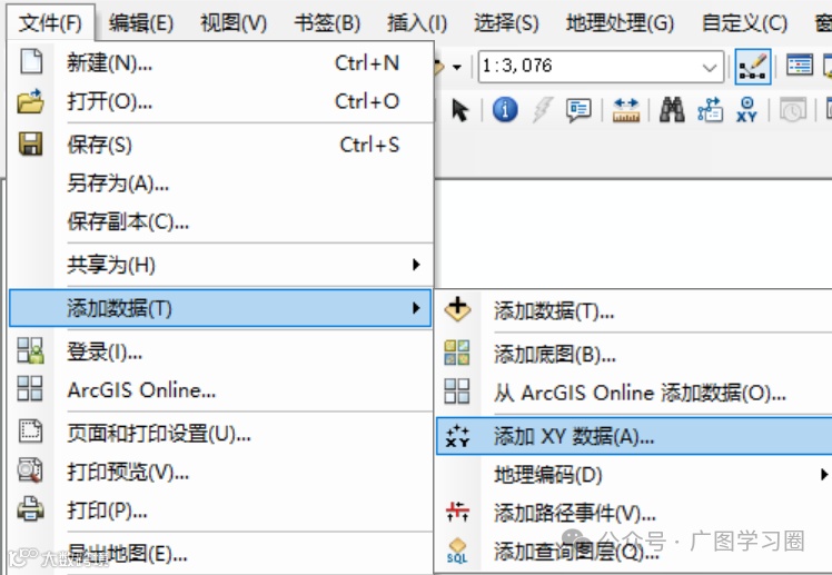 (2)点击“文件”菜单栏,在下拉菜单中找到并依次点击“添加数据”——“添加XY数据”。