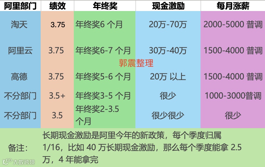 年终奖方面,阿里绩效评分3.75及以上的员工占比约30%,可获得至少5个月年终奖,并享受每月不低于1500元的普调[k];绩效3.5的员工占比约60%,可获得至少2个月年终奖[k]。