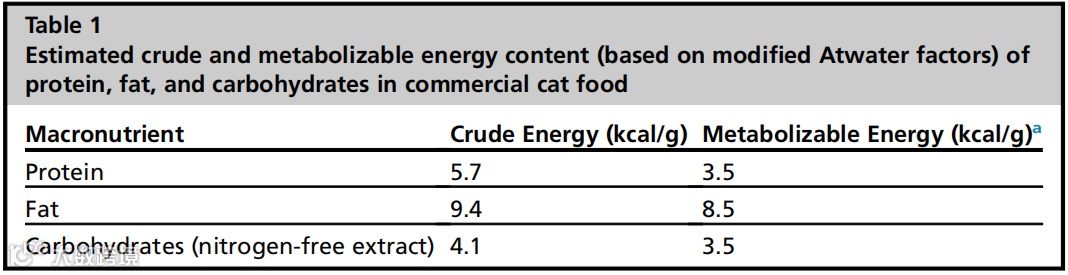 三大常量营养素——蛋白质、脂肪和碳水化合物中,脂肪提供的代谢能高于蛋白质和碳水化合物两倍以上[k]。美国饲料管理官方协会(AAFCO)和美国国家研究委员会(NRC)设定了蛋白质和脂肪的最低摄入标准,但未对碳水化合物提出最低要求,因其可通过糖异生途径由氨基酸或甘油合成[k]。