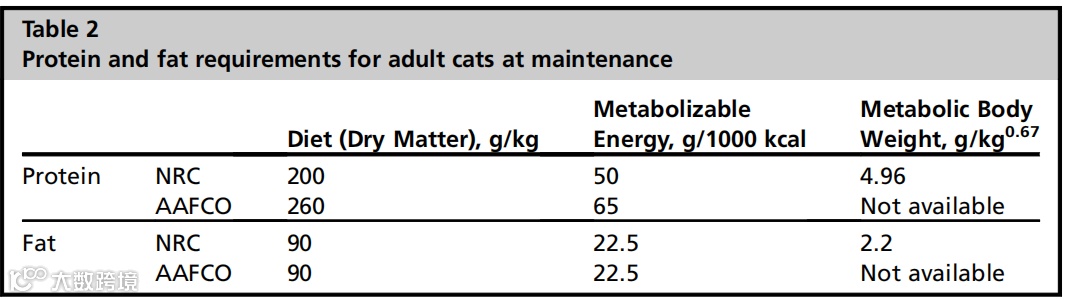 NRC与AAFCO未设定蛋白质最高摄入限值,因目前无证据显示高蛋白饮食对健康猫有害,但肾病或尿酸盐结石患猫需限制蛋白摄入[k]。