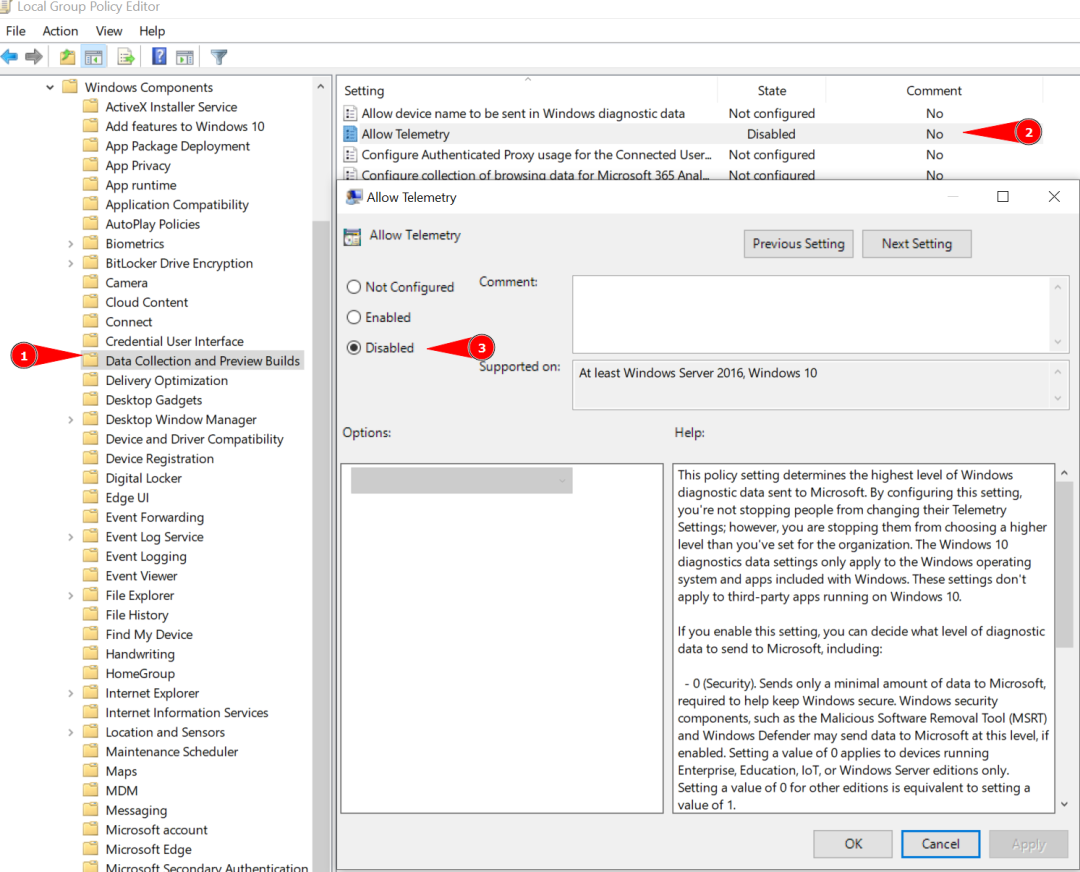 当您设置允许遥测→禁用时,您就是在告诉 Windows根本不要发送可选的诊断数据。