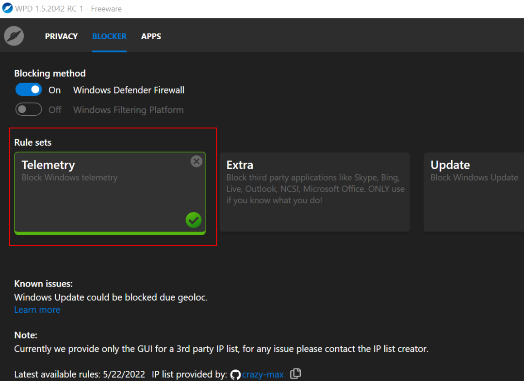 此外,WPD Blocker 允许用户通过防火墙规则阻止 Microsoft 遥测数据,主要启用遥测数据,并可选配 Extra/Update 设置以供高级使用。阻止可能会影响 Windows 更新等服务,但可以使用维护的 IP 列表来撤销规则。