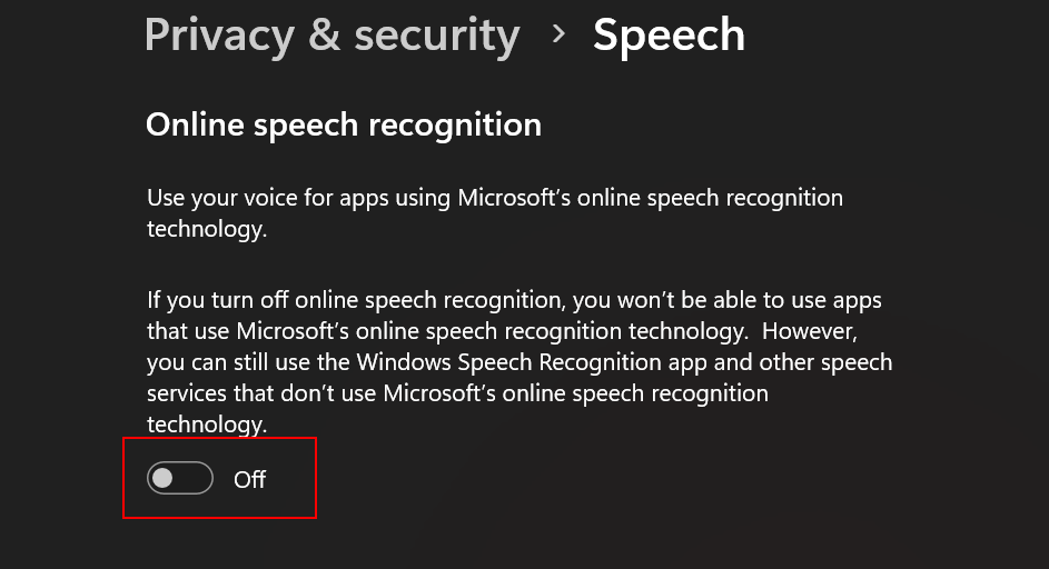 此屏幕显示“隐私和安全”>“语音”,在线语音识别已关闭,这会阻止应用程序将语音片段发送到 Microsoft 的云;本地 Windows 语音识别仍然有效。