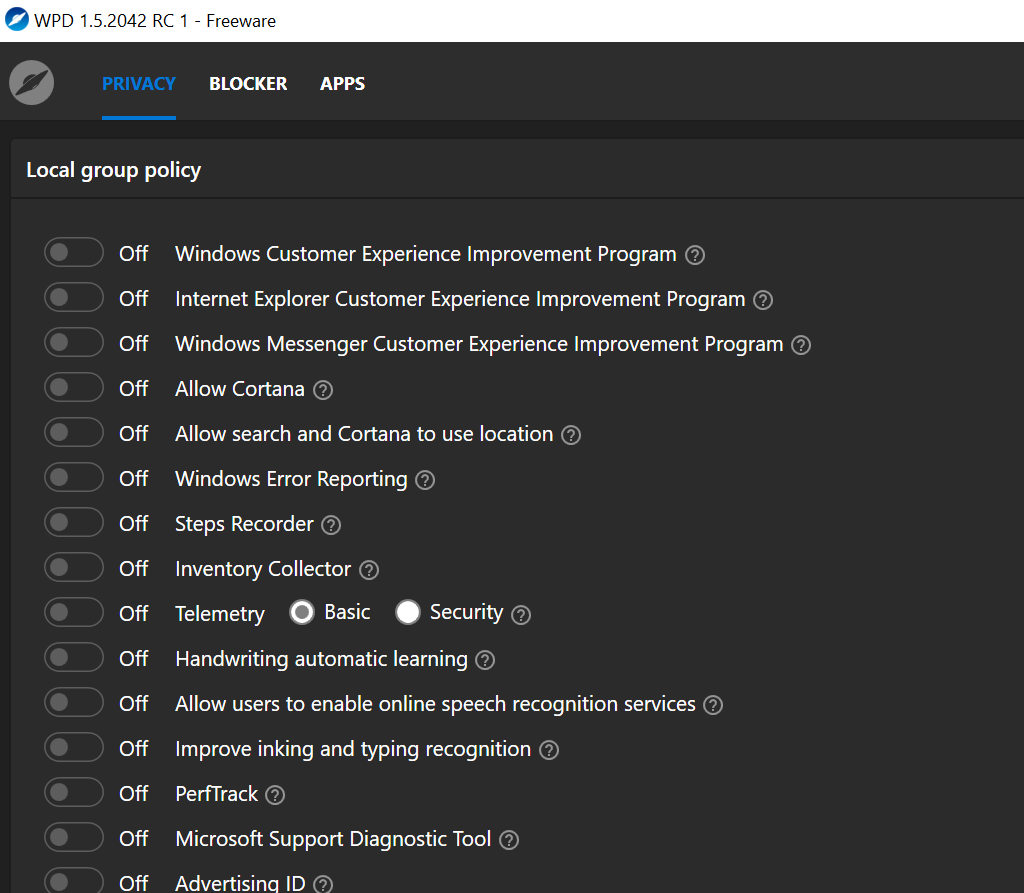 WPD 主屏幕提供一键控制功能,可禁用 Windows 遥测并阻止遥测 IP,并支持安全回滚。它易于移植,并分为隐私、阻止程序和应用模块,可轻松强化 Windows 安全。