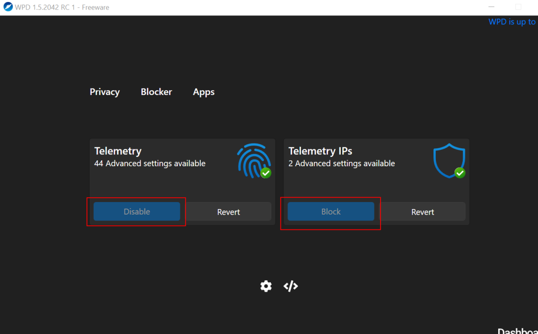 WPD 仪表板允许用户快速禁用 Windows 遥测并阻止遥测 IP,并支持安全回滚。高级设置和防火墙规则可在“隐私”、“阻止程序”和“应用”选项卡下进行微调,以更深入地强化 Windows 安全。