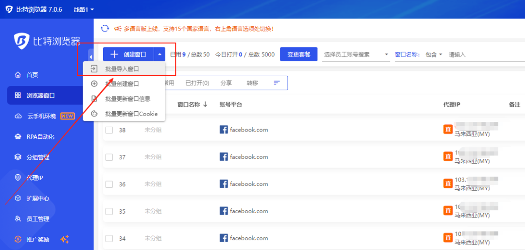 打开客户端 → 浏览器窗口 → 点“创建窗口”右侧的“▼” → 选“批量导入窗口”