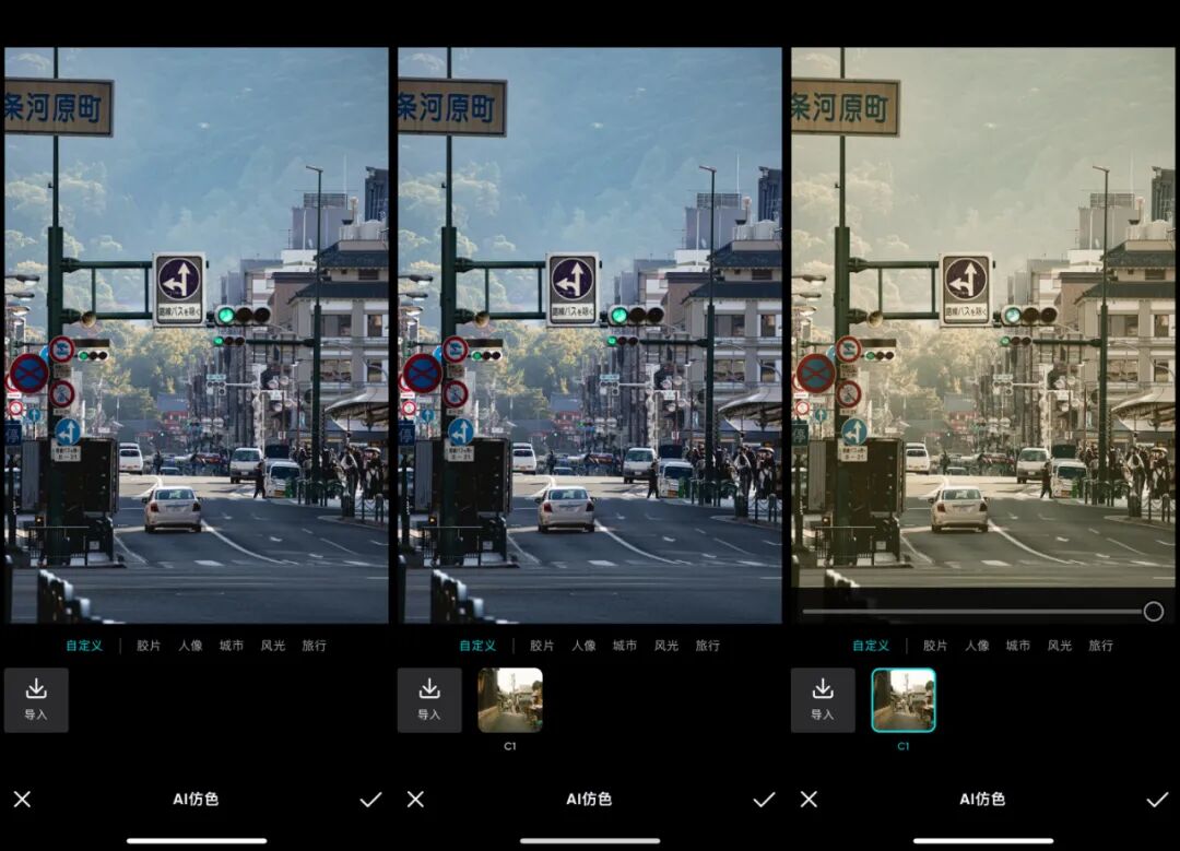 第一步我们先应用AI仿色,我们打开一张照片,然后选择自定义,接着将我们想要得到的照片色调导入,然后应用就可以得到一个大致色调: