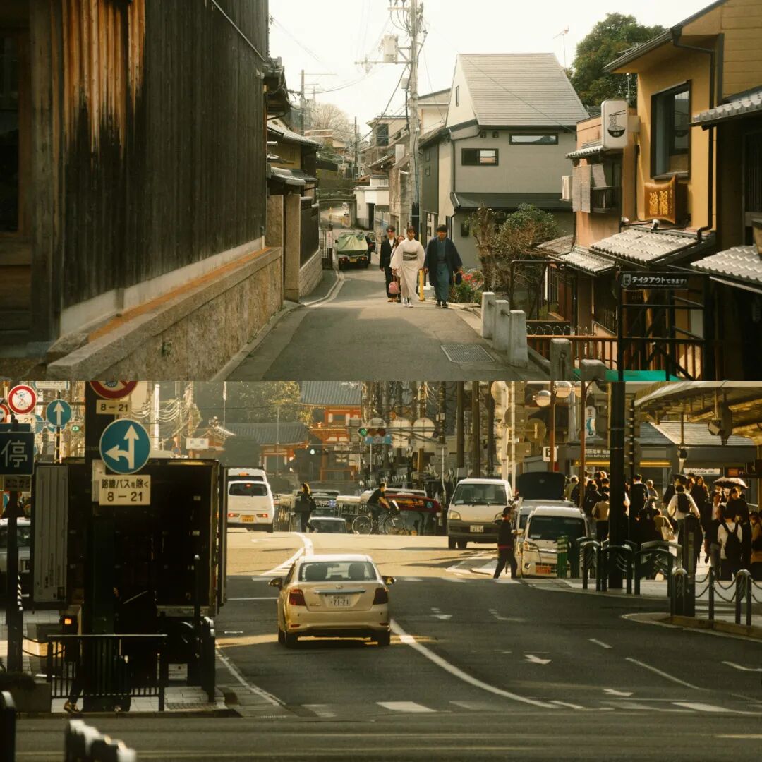 暖色调主导:画面中的建筑、路面、木质结构带有暖棕色,而天空和远处的房屋则略带冷灰色,形成微妙的色温对比。